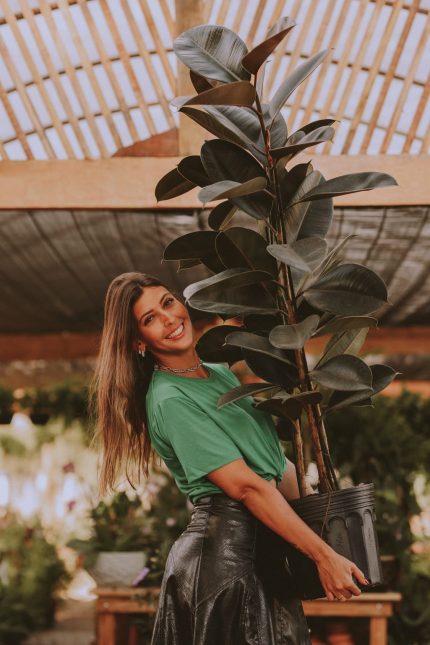 É uma planta tropical, originária de uma vasta região que se estende desde o subcontinente indiano até à Malásia e à Indonésia, frequentemente utilizada como árvore de interior ornamental. Sua folhagem com aspecto de couro trazem elegância e aconchego aos ambientes.O nascimento de uma folha nova, é mais um show particular, revestida de capa vermelha. Planta maravilhosa e irresistível.