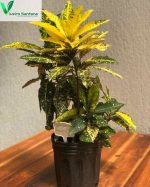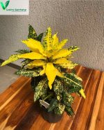 - Folhagem: Amarela vibrante com manchas verdes, formato ovalado e brilhante