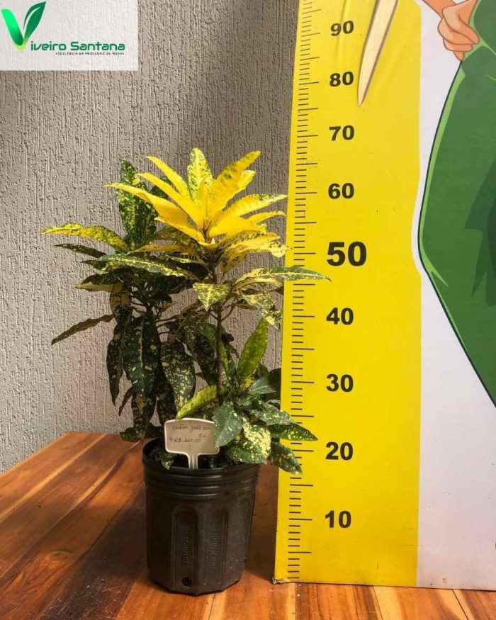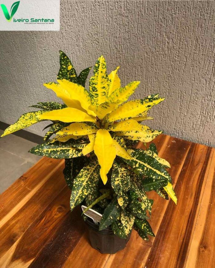 - Folhagem: Amarela vibrante com manchas verdes, formato ovalado e brilhante