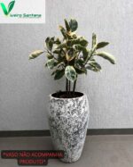 Folhas: Grandes, coriáceas, com bordas creme/amareladas e tons rosados nos brotos novos