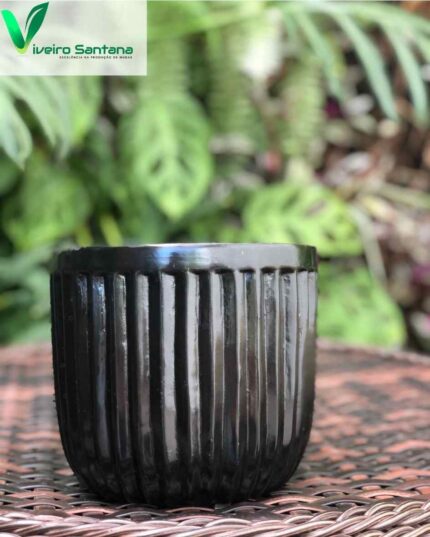 Vaso preto, tamanho pequeno. Sofisticado e elegante, ideal para valorizar plantas de porte médio a grande.
